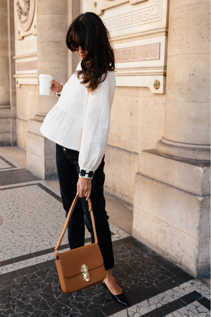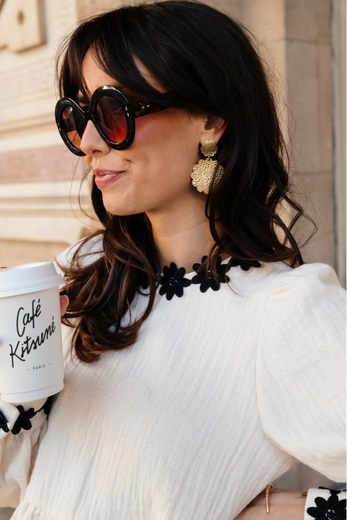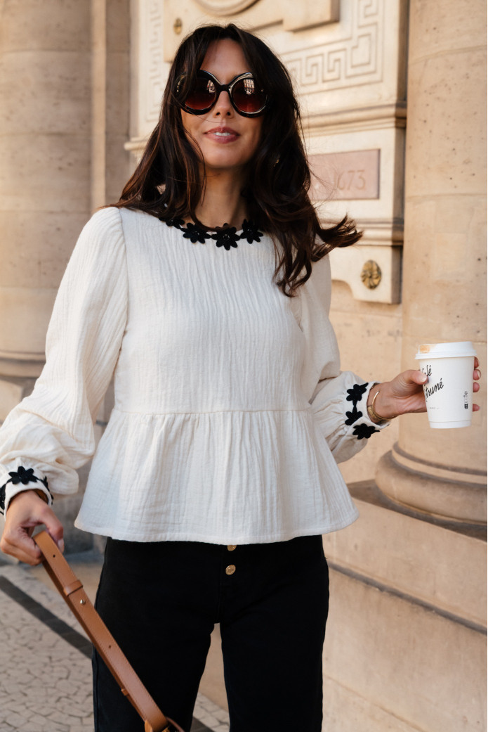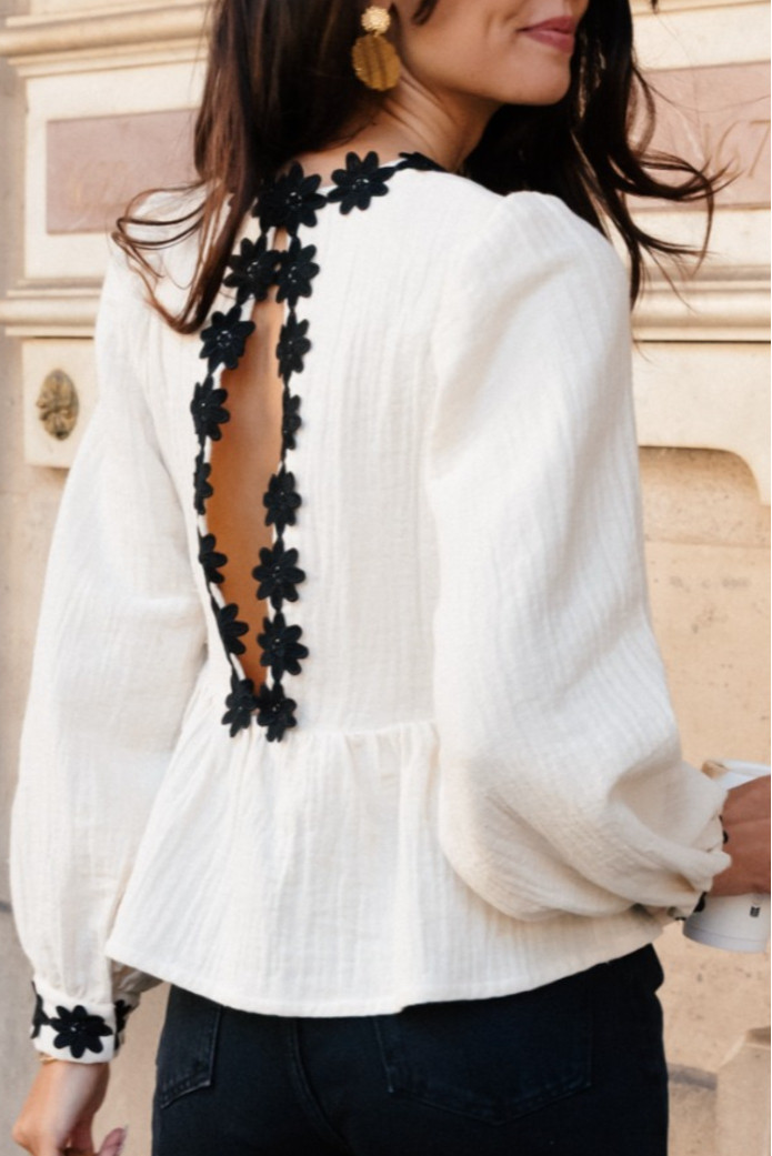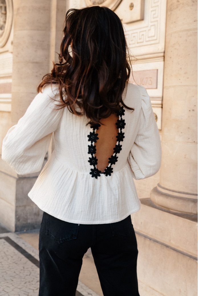 - L'encolure, poignets et l'ouverture dos est soulignée par un galon fleur