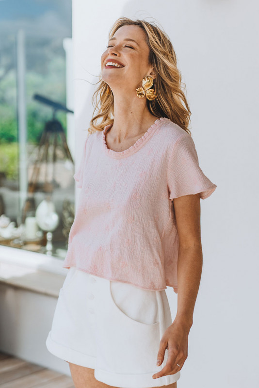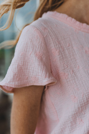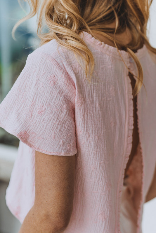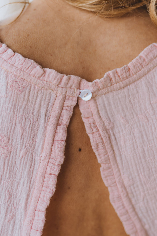 Et le détail osé par notre équipe cré : son dos totalement ouvert et fermé par un bouton au niveau du col ! Nous lui avons également imaginé un joli col rond décoré d'un petit volant.
