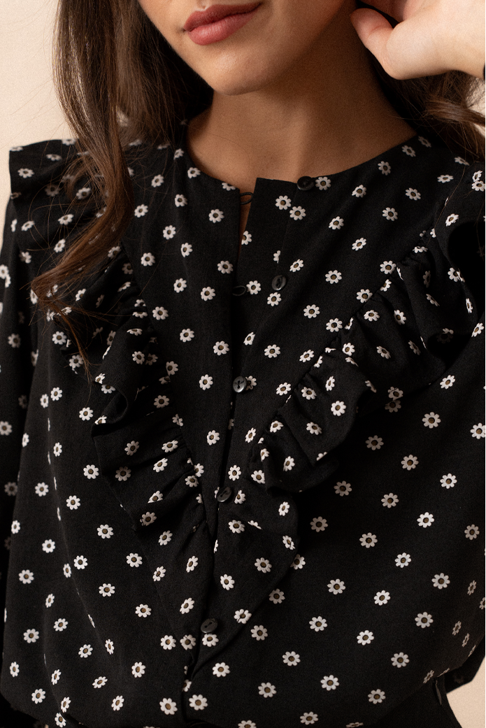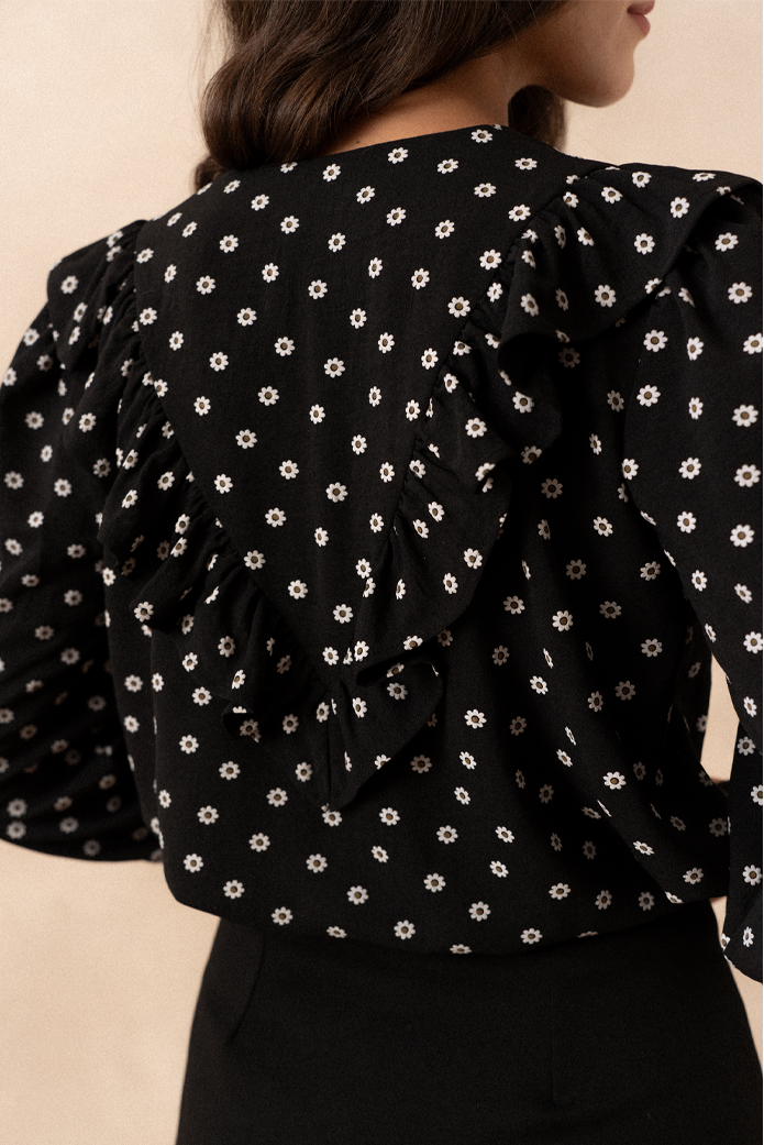 - Empiècement en V volantée sur le devant et le dos