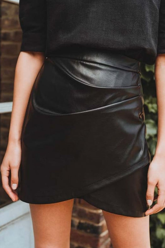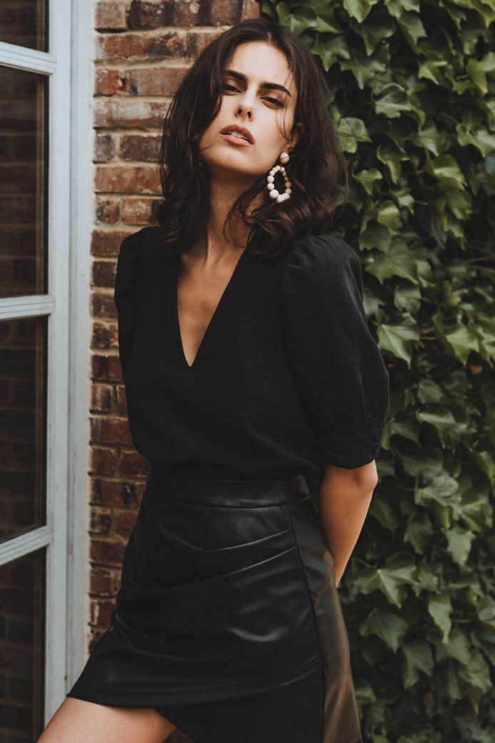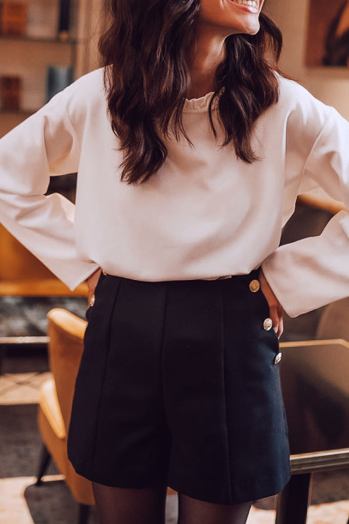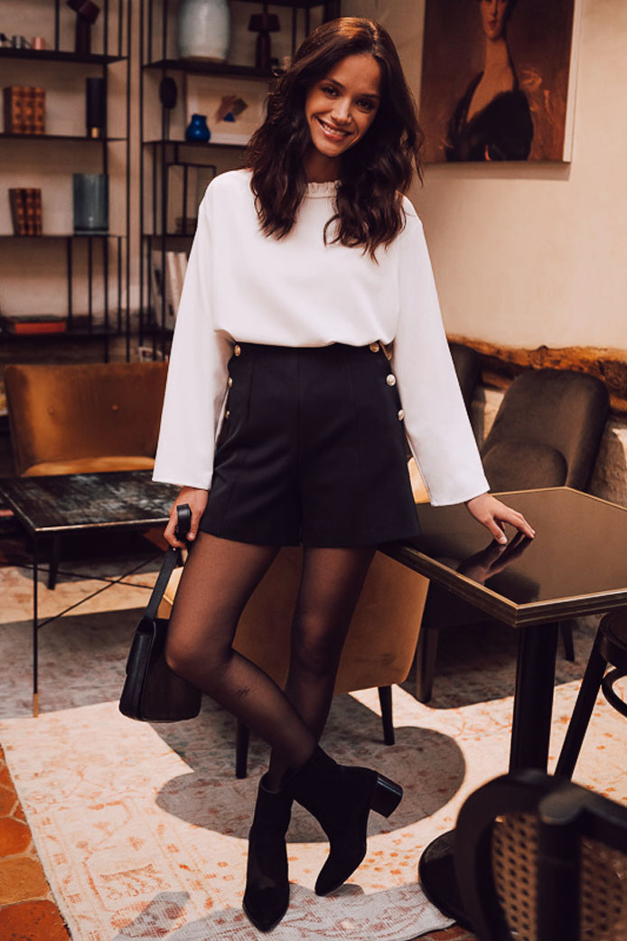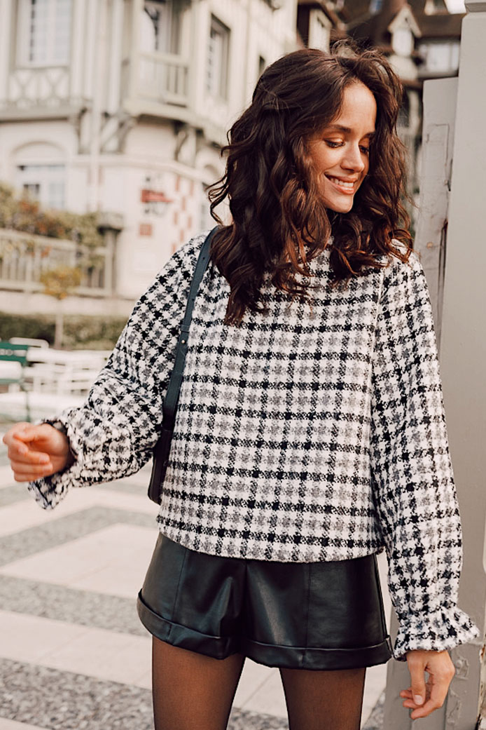 BLOUSE COLOMBINE CARREAUX GRIS - 95€ / SHORT GUILLAUME SIMILI CUIR NOIR - 95€