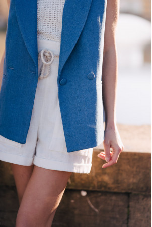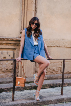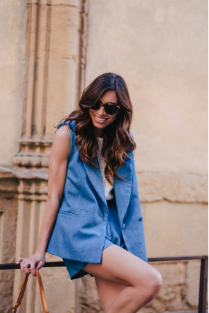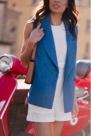 This is the fashion piece of the season! The sleeveless suit jacket that will mix well with shorts, jeans, or even a skirt for a casual chic look.