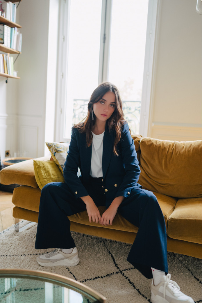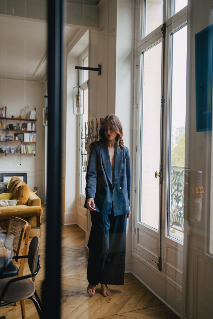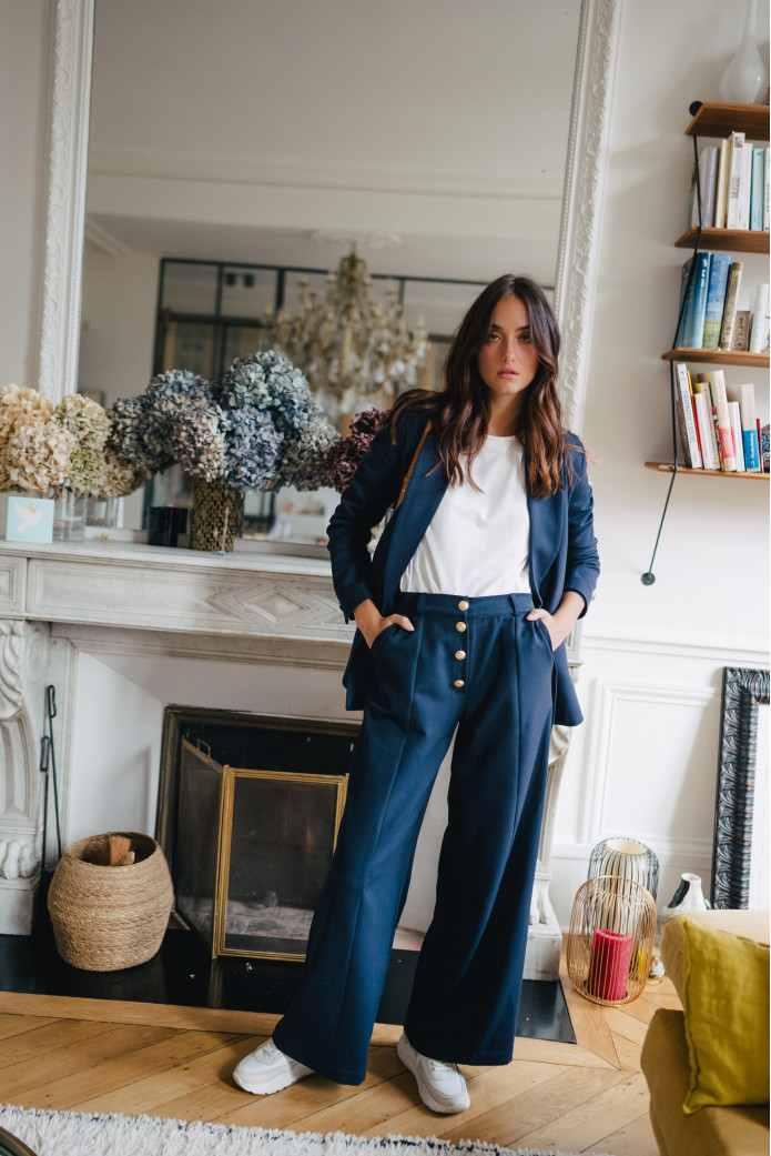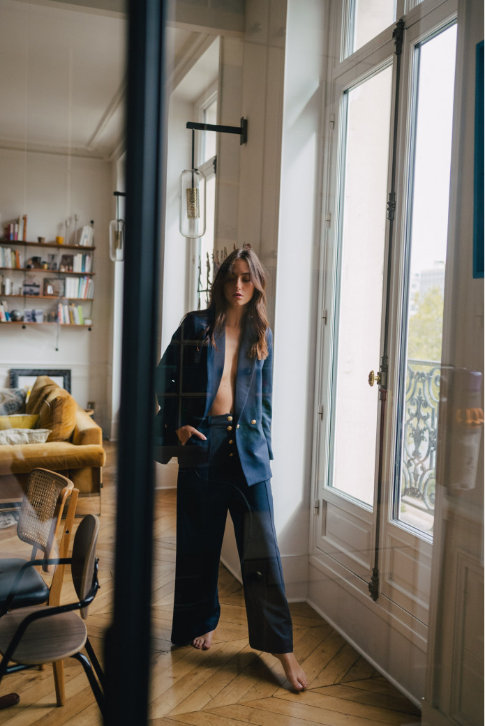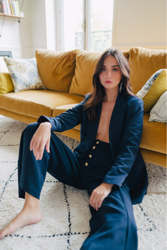 - Straight tailored jacket with volume under the buttocks, slit at the back, gold buttons
