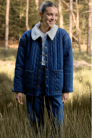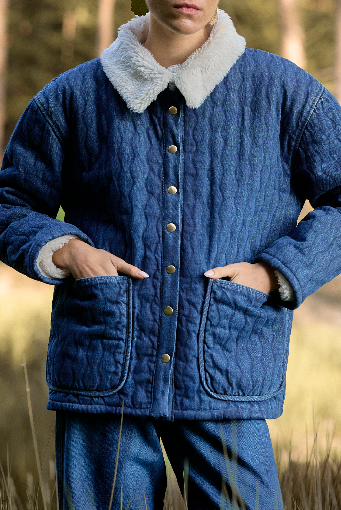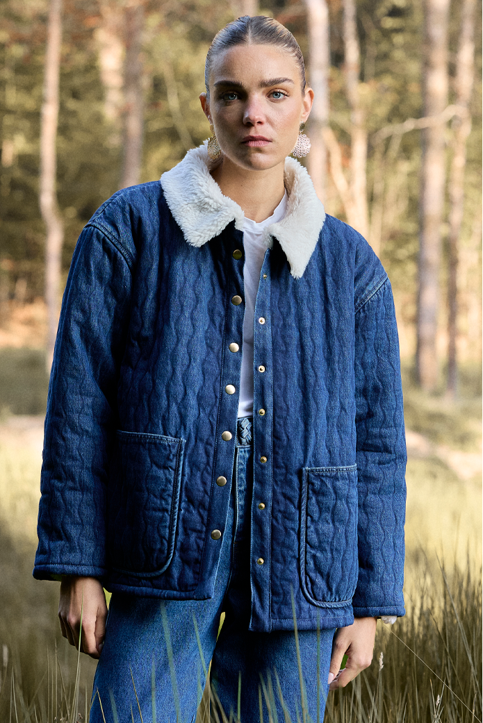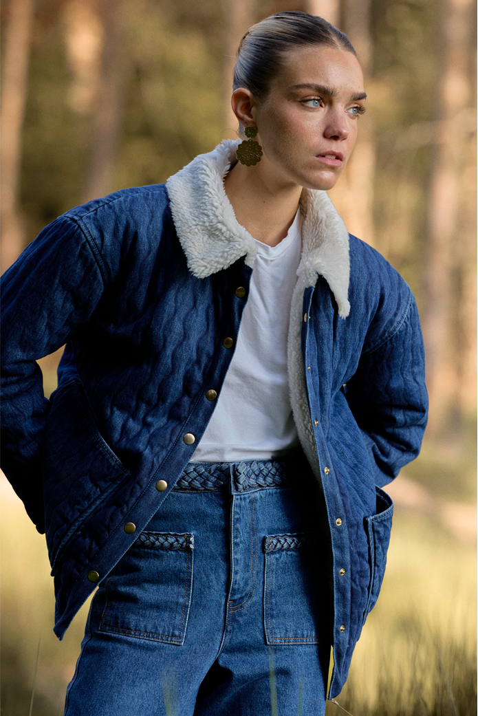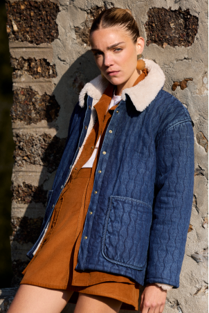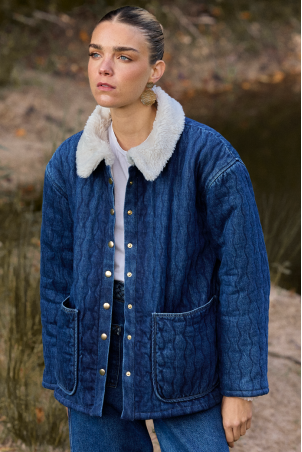 - Oversized quilted denim jacket lined with bouclé fabric faux fur effect