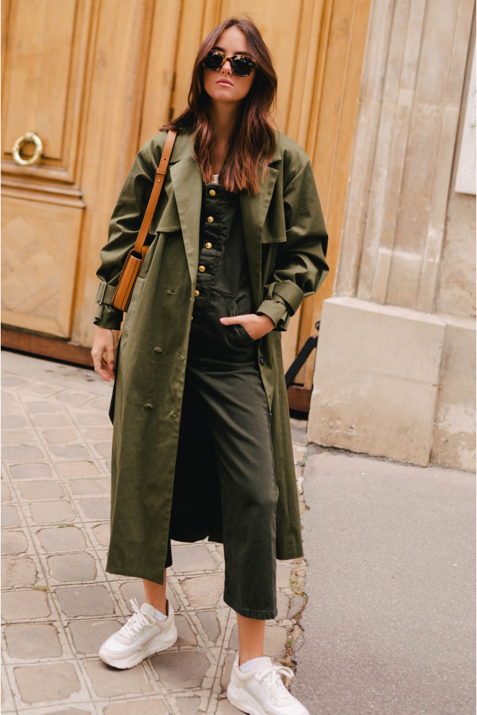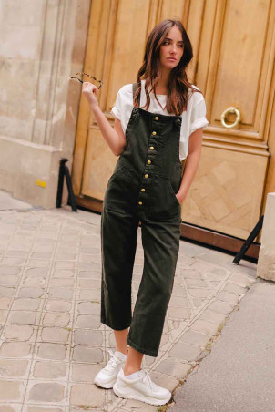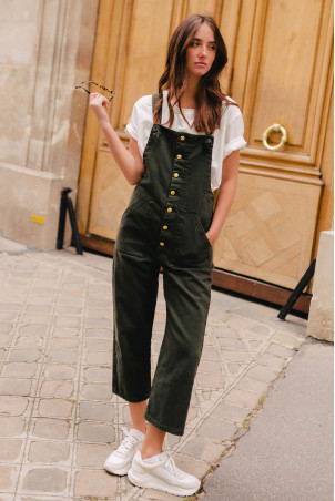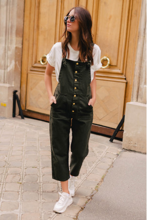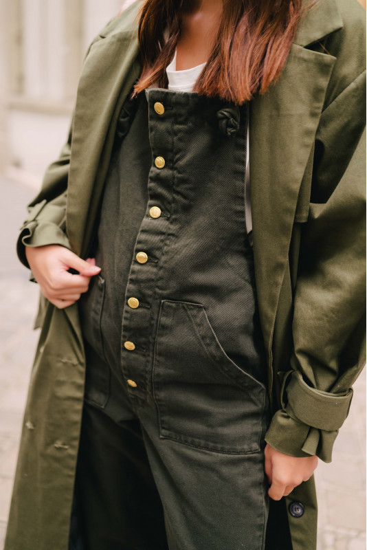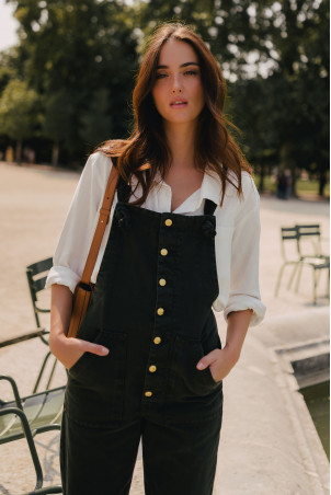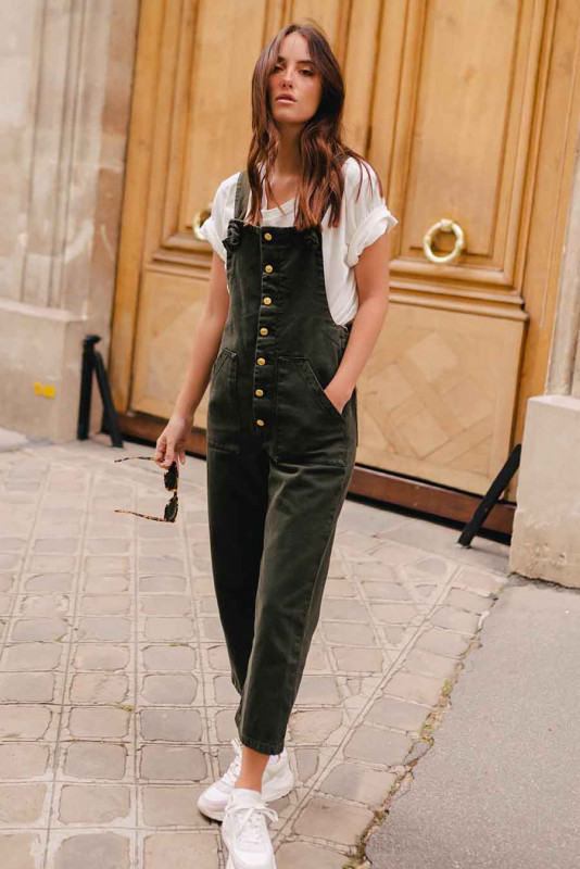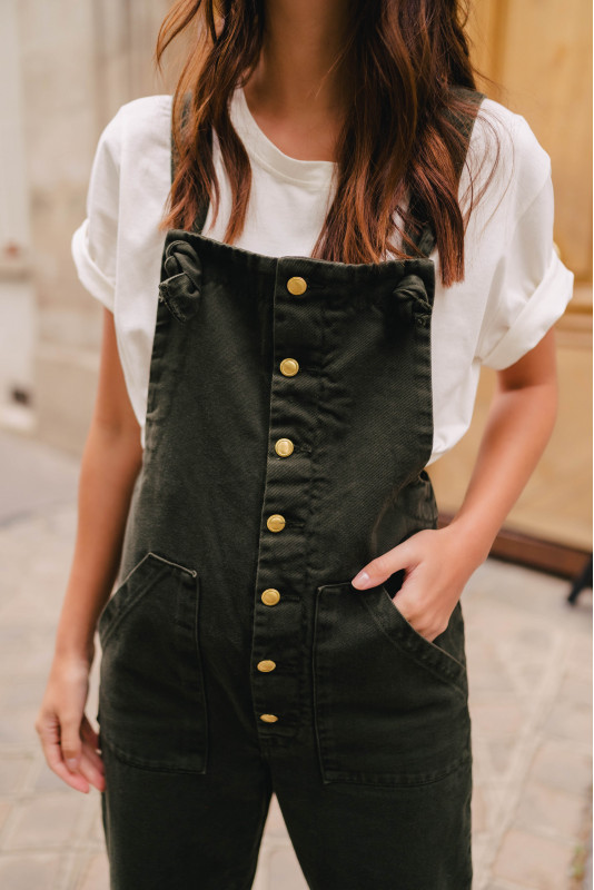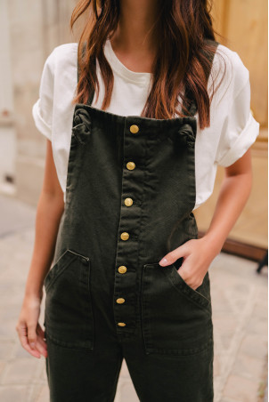 - Straight leg button-up overalls, tied straps, front and back patch pockets