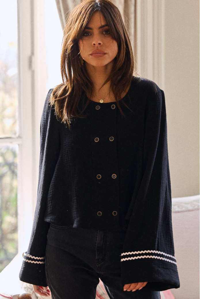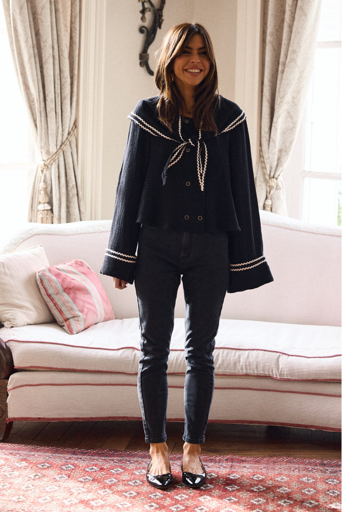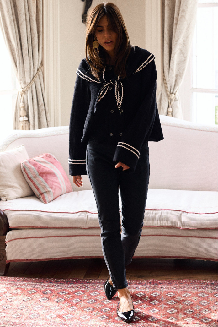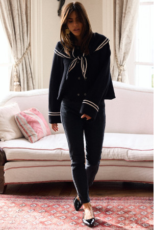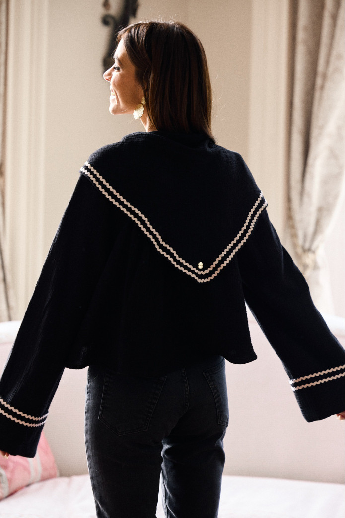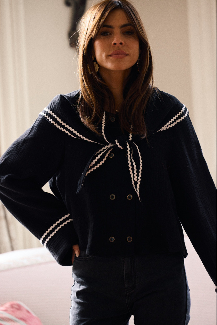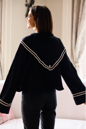 - Larges revers bas de manche et foulard soulignés par deux rangées de serpentin contrasté